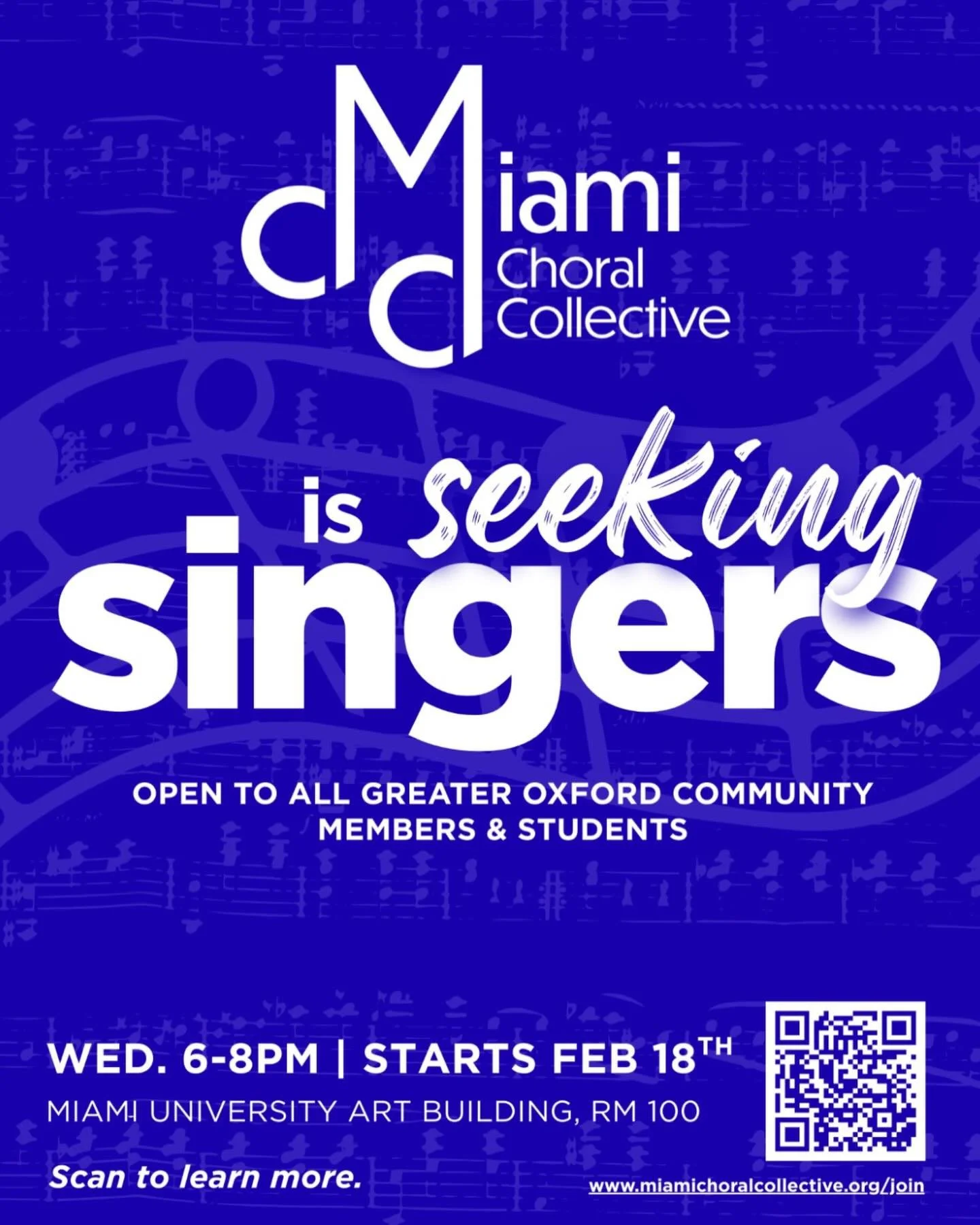 Miami Choral Collective is a mixed voice community choir in Oxford, Ohio (home of Miami University). Established in 2024 by founding co-directors Jeremy Jones and Reina Dickey, MCC unites the University community of students, faculty, and staff with the broader Oxford community to create a shared and meaningful experience through singing.